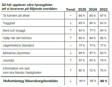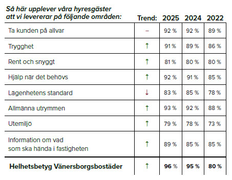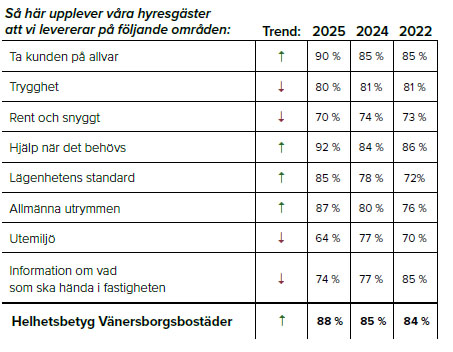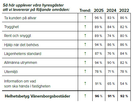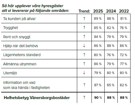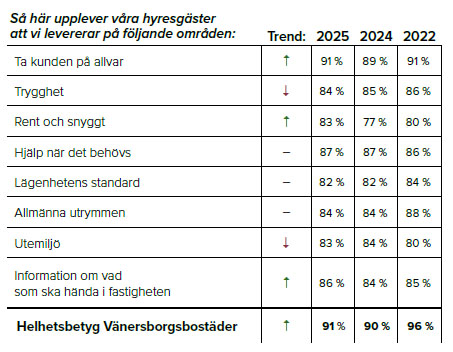 Här nedanför ser du resultaten från hyresgästundersökningen 2025. I vårt bomagasin Dörrposten kan du läsa mer. Där hittar du redovisningen av vilka löften vi hållit från föregående år, vad vi planerar att utföra 2026.