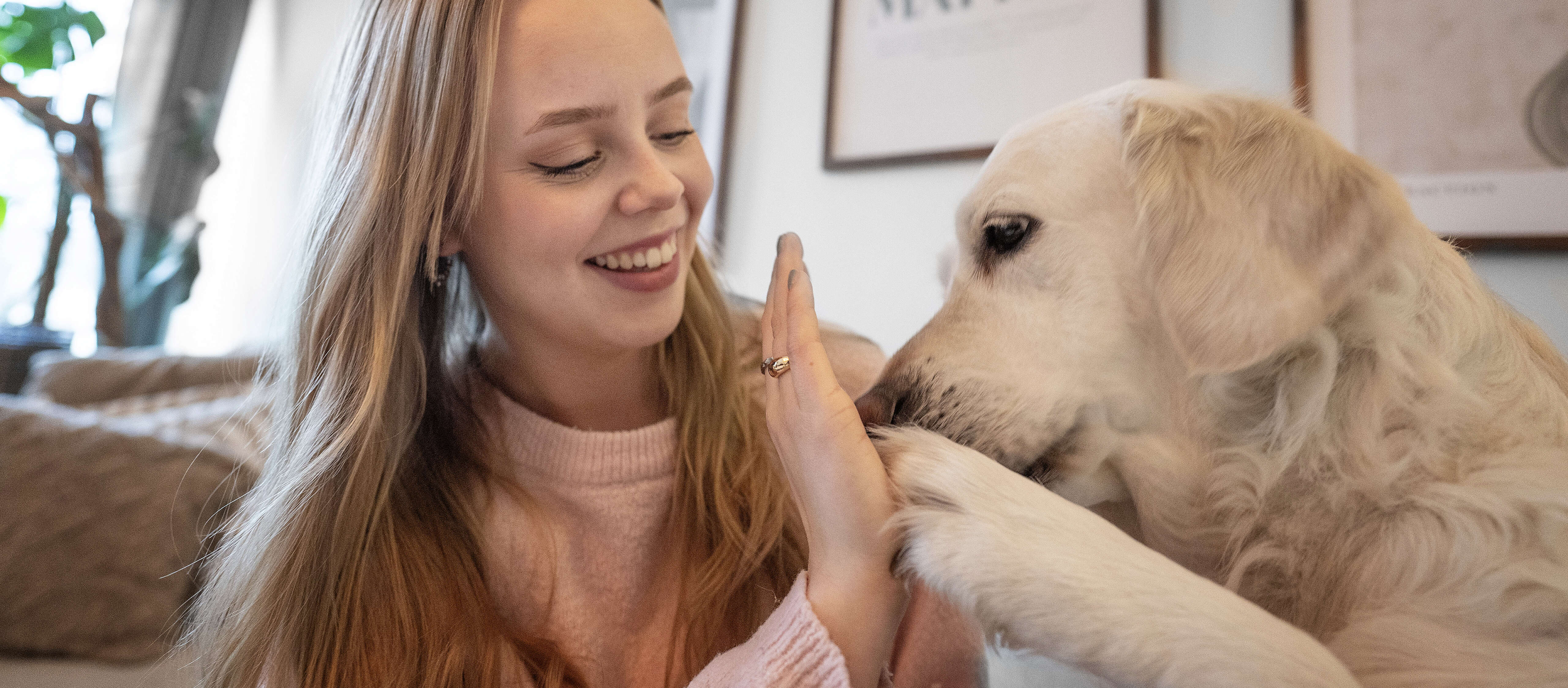Vi hinner knappt komma in i hallen innan TikTok-kändisen Sally kommer springande med viftande svans och en leksak stadigt i munnen. Bakom det entusiastiska välkomnandet väntar ett hem inrett i lugna och mjuka toner.